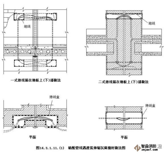 管路在通過建筑物的變形縫時,應加裝管路補償裝置。管路補償裝置是在變形縫的兩側對稱預埋一個接線盒,用一根短管將兩接線盒相鄰面連接起來,短管的一端與一個盒子固定牢固,另一端伸入另一盒內,且此盒上的相應位置的孔要開長孔,長孔的長度不小于管徑的2倍。如果該補償裝置在同一軸線墻體上,則可有拐角箱作為補償裝置,如不在同一軸線上則可用直筒式接線箱進行補償。做法可參照圖14.3.1.11?(1)?(2)。也可采用防水型可撓金屬電線管跨越兩側接線箱盒并留有適當余量。