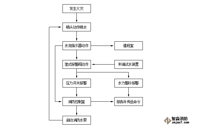 當(dāng)發(fā)生火災(zāi)時(shí),灑水噴頭的感溫元件自動(dòng)脫落,并開(kāi)始向保護(hù)區(qū)灑水,由于系統(tǒng)內(nèi)的水由原來(lái)的相對(duì)靜止?fàn)顟B(tài),變?yōu)榱鲃?dòng)狀態(tài),水流指示器感應(yīng)并送出信號(hào),造成濕式報(bào)警閥的上下部的水壓差,從而開(kāi)啟閥片,使供水管路暢通。根據(jù)水流指示器和壓力開(kāi)關(guān)的信號(hào),控制器啟動(dòng)消防水泵向管網(wǎng)加壓供水,達(dá)到持續(xù)自動(dòng)噴水滅火的作用。其工作原理如下圖: