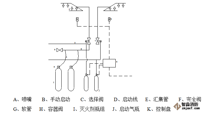 本系統(tǒng)的主要設(shè)備和器材包括:?jiǎn)?dòng)氣瓶、啟動(dòng)氣瓶、滅火劑瓶組、控制器、選擇閥、安全閥、容器閥、噴嘴等。