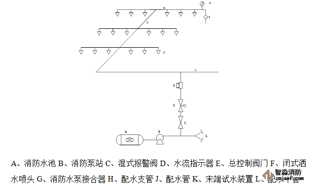 自動(dòng)噴水滅火系統(tǒng)由水源、加壓送水、報(bào)警閥、管網(wǎng)噴頭以及火災(zāi)探測(cè)系統(tǒng)等組成。本自動(dòng)噴水滅火系統(tǒng)屬于濕式自動(dòng)噴水滅火系統(tǒng)。其結(jié)構(gòu)如下圖: