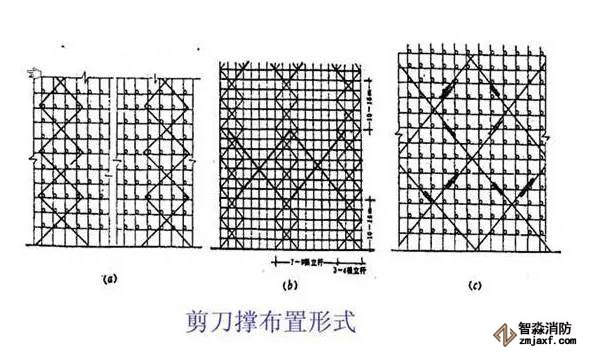 ⒊剪刀撐:四角應設抱角斜撐,四邊設剪刀撐,中間每隔四排立桿沿縱向設一道剪刀撐,斜撐和剪刀撐均應由下而上連續設置。