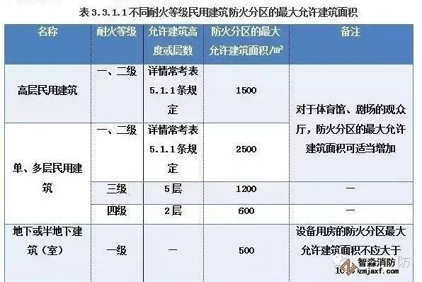 單層、多層民用建筑防火分區面積是以建筑面積計算的。每個防火分區的最大允許建筑面積應符合表3.3.1.1的要求。