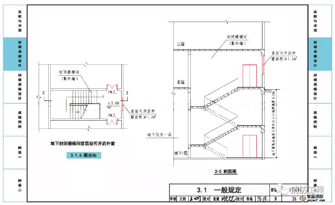 第3.3.11條設置機械加壓送風系統(tǒng)的封閉樓梯間、防煙樓梯間,尚應在其頂部設置不小于1㎡的固定窗。靠外墻的防煙樓梯間,尚應在其外墻上每5層內設置總面積不小于2㎡的固定窗。海灣消防www.gstcp.com