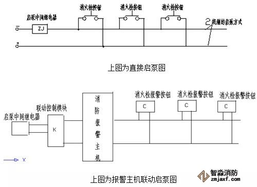 1.火災報警控制器多線盤啟動消防泵方式,其工作原理是消防主機多線按鈕啟動多線模塊,模塊動作啟動水泵。優點:線路、設備故障可以監視。缺點:水泵控制柜必須放置于自動擋,消防主機損壞將無法啟動水泵。