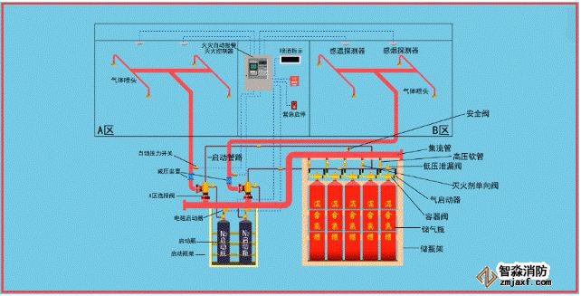 該系統(tǒng)由滅火劑儲(chǔ)存裝置、總控閥、驅(qū)動(dòng)器、噴頭、管道超壓泄放裝置、信號反饋裝置、控制器等組成。