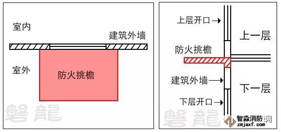 防火挑檐是挑出建筑外立面,具有一定寬度和長度的防火分隔措施,防火挑檐可以防止火災通過建筑外立面的開口(從建筑外部)在上下層間蔓延。