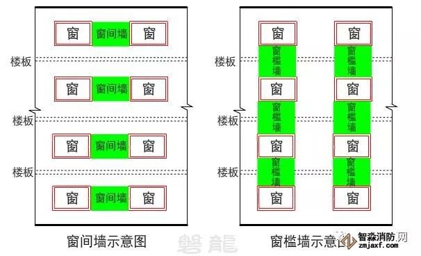 窗間墻的功能,主要是防止火災通過建筑外立面的開口(從建筑外部)在同層蔓延,通常包括以下情況: