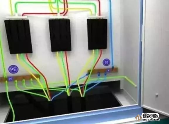 6、黃、綠、紅三相線分別從分配電箱的分路隔離開(kāi)關(guān)引出,從N板接線端子引出淡藍(lán)色的工作零線,從PE板接線端子引出黃綠雙色保護(hù)零線。