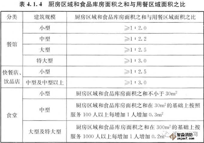 一、廚房區域和食品庫房面積之和與用餐區域面積之比宜符合表4.1.4的規定。(4.1.4)