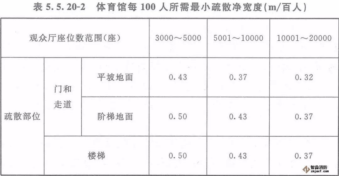 3、體育館供觀眾疏散的所有內門、外門、樓梯和走道的各自總凈寬度,應根據疏散人數按每100人的最小疏散凈寬度不小于表5.5.20-2的規定計算確定;