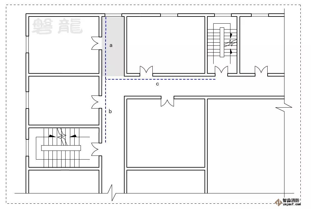 注:本圖示僅有一個方向能到達安全出口,不應許可。確有需要時,宜按袋形走道處理,按最不利情況下的折返長度(2a+2b+c)計算疏散距離。比如,一二耐火等級的高層教學建筑:(2a+2b+c)≤15m。