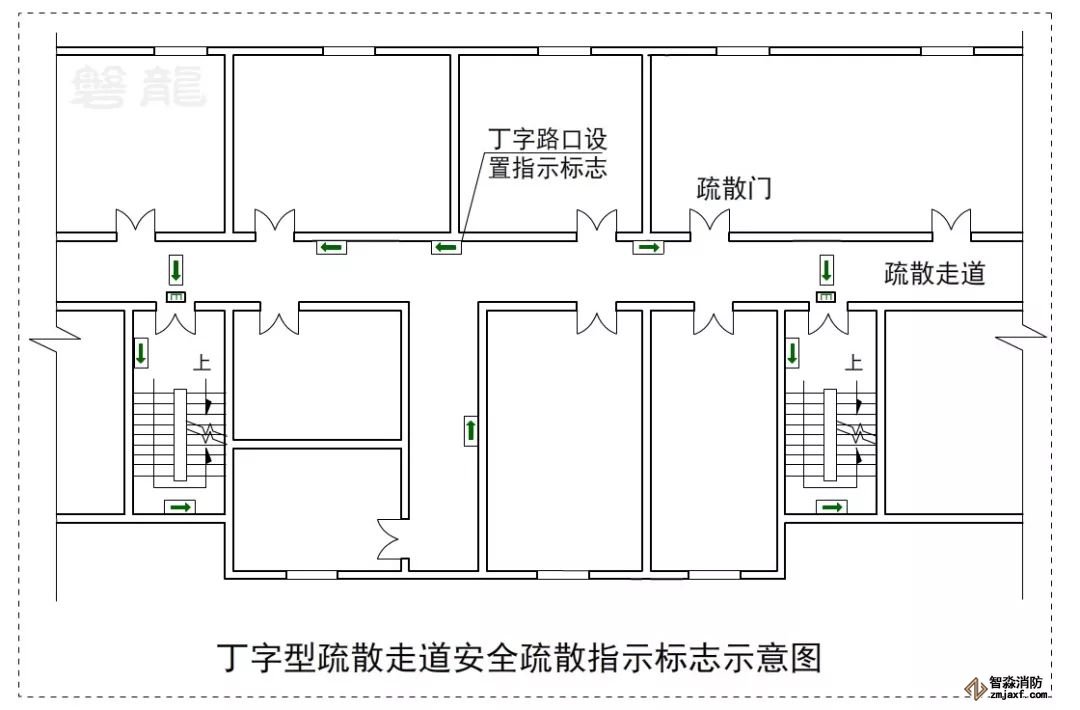 對于T字形或回形疏散走道,必須輔以正確的疏散指示標志和應急照明系統,對于設置機械排煙系統的疏散走道,排煙口的設置宜使煙流方向與人員疏散方向相反。