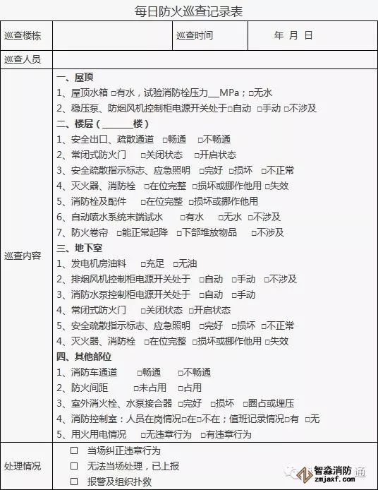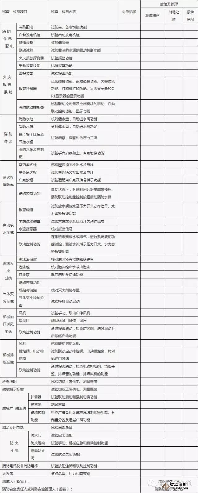 1、建筑消防設施巡查應明確各類建筑消防設施巡查部位,巡查應當每周至少一次,并填表。依法開展每月防火巡查的單位和設有電子巡查更系統的單位,應將建筑消防設施巡查部位納入其中。