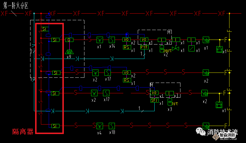 在總線制火災自動報警系統(tǒng)中,因各種原因有時會出現(xiàn)某一局部總線出現(xiàn)故障(例如短路),可能會造成整個報警系統(tǒng)全線癱瘓的情況。而使用隔離器串入總線的各段或串入主線與支線的交界處,一旦出現(xiàn)總線回路某處短路,隔離器就會將發(fā)生故障的總線部分與整個系統(tǒng)隔離開來,以保證系統(tǒng)的其它部分能夠正常工作。
