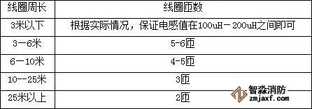 為了使檢測器工作在最佳狀態(tài)下,線圈的電感量應保持在100uH-300uH之間。在線圈電感不變的情況下,線圈的匝數與周長有著重要關系。周長越小,匝數就越多。一般可參照下表: