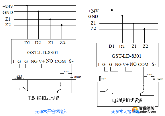Z1、Z2:接火災(zāi)報(bào)警控制器信號(hào)二總線,無(wú)極性