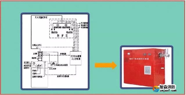 該系統(tǒng)由滅火劑瓶組、加壓氣體瓶組、驅(qū)動氣體瓶組(可選)、單向閥、選擇閥、減壓裝置、驅(qū)動裝置、集流管、連接管、噴頭、信號反饋裝置、安全泄放裝置、控制盤、檢漏裝置、管道管件及吊鉤支架等組成。