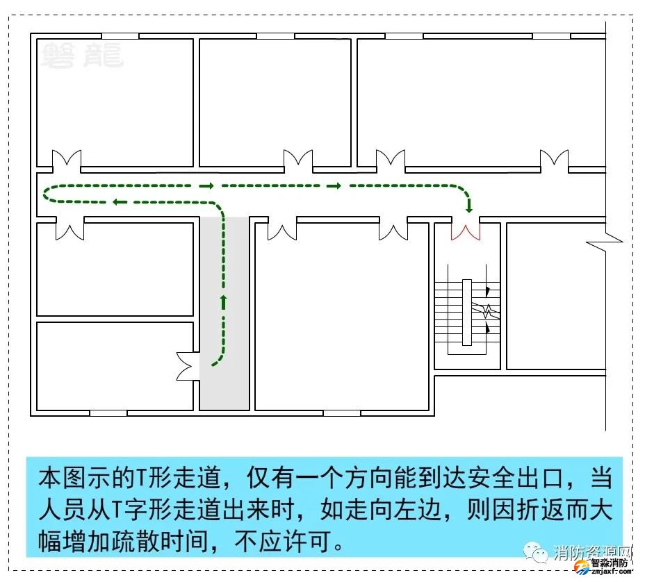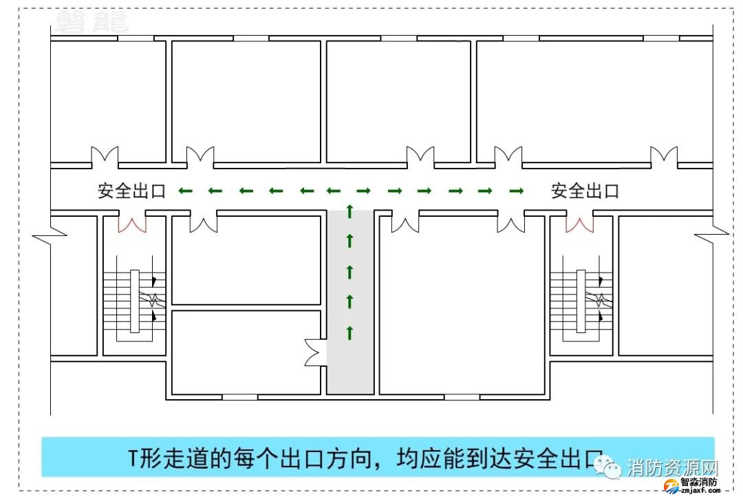 T形走道也稱為丁字形走道,是消防安全疏散設計中不可回避的形式,關于T形疏散走道的疏散距離計算,參專題:T形走道-宜與忌!疏散距離計算規則!