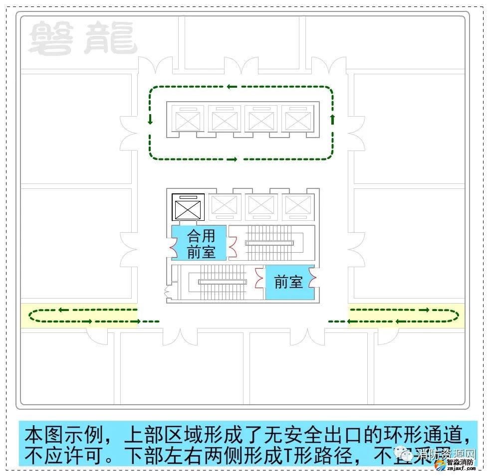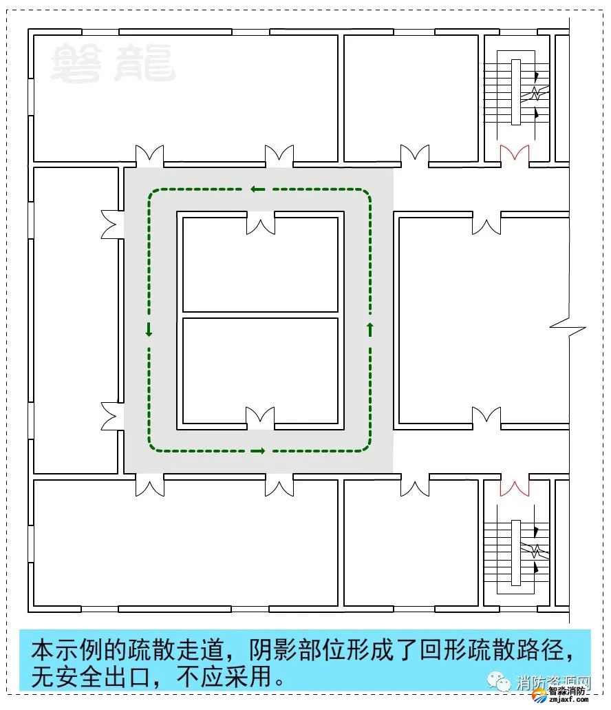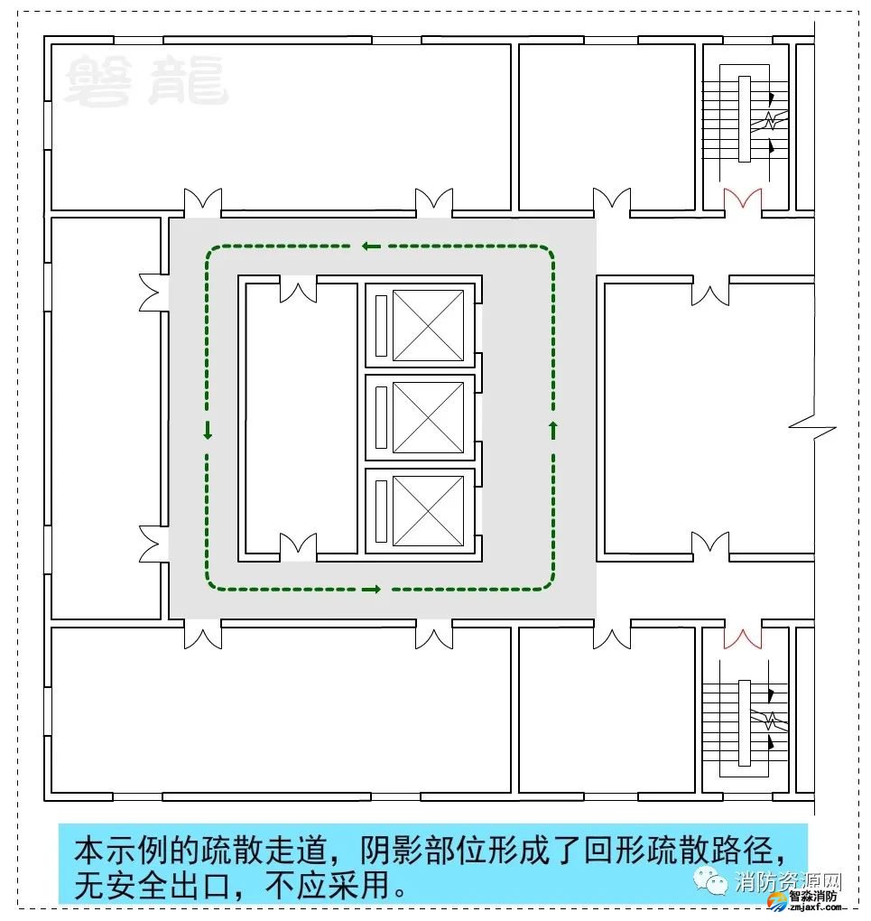 1、圖示9、圖示10所示的疏散走道,示例部位形成環形疏散路徑,沒有安全出口,不應采用。