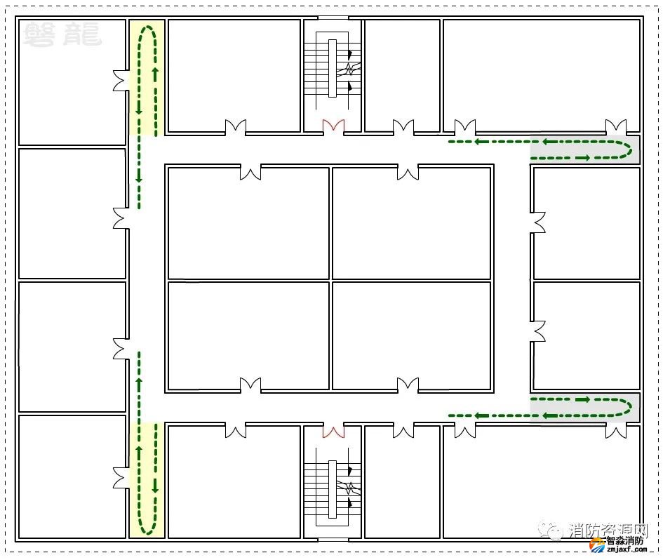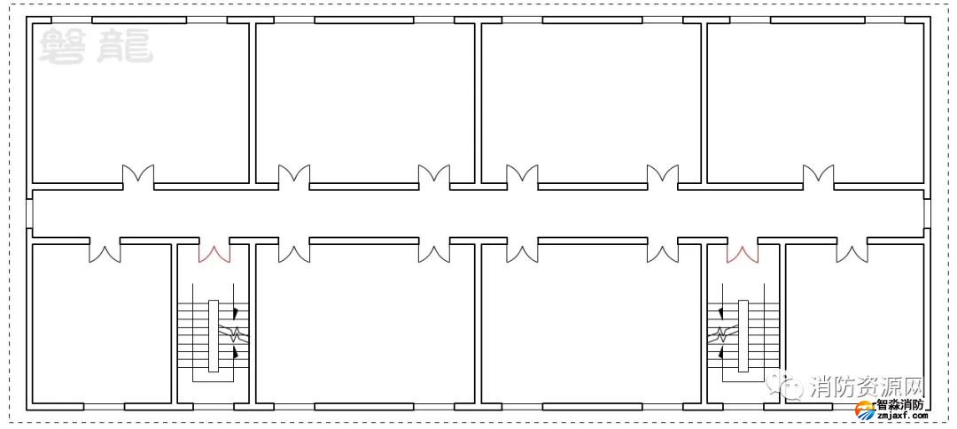 二、圖示2的疏散走道,僅設置有一個疏散樓梯,疏散走道的所有疏散門均為單向疏散,整個疏散走道均應視為單向疏散走道,即袋形走道: