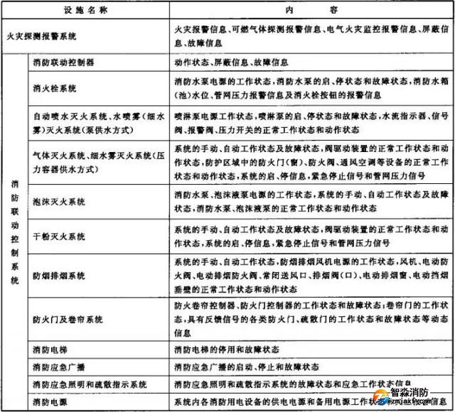 2、消防控制室內設置的消防設備應能監控并顯示建筑消防設施運行狀態信息,并應具有向城市消防遠程監控中心(以下簡稱監控中心)傳輸這些信息的功能。建筑消防設施運行狀態信息見下表1。