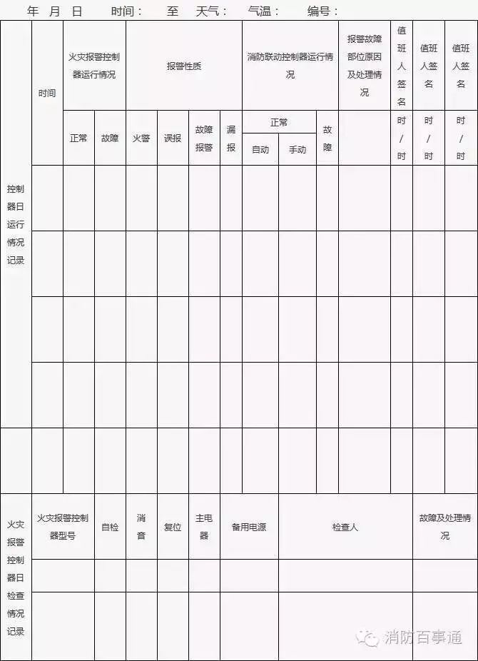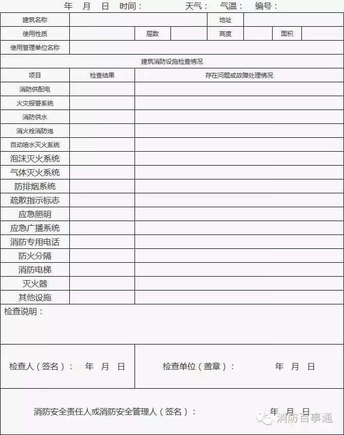 2、發(fā)現(xiàn)的問(wèn)題或存在故障應(yīng)在“實(shí)測(cè)記錄”欄中填寫(xiě),并及時(shí)處置;當(dāng)場(chǎng)不能處置的要填報(bào)《建筑消防設(shè)施故障處理登記表》;