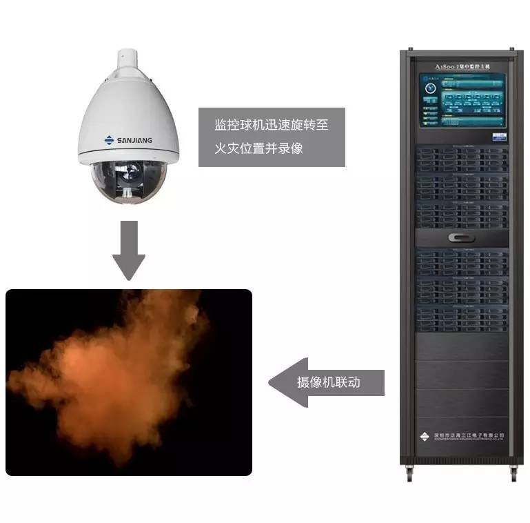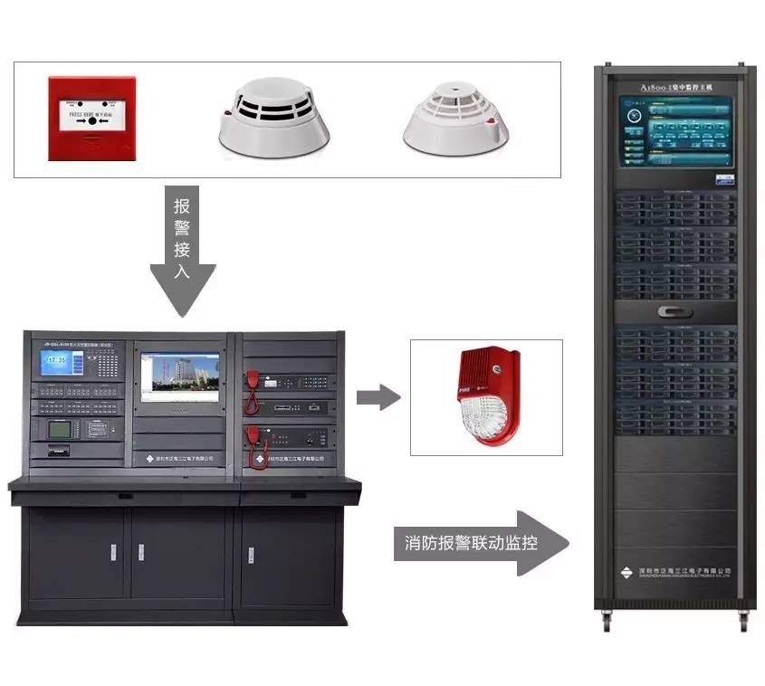 2、當報警情況發生時,信號反饋傳入監控室的消防主機,驅動聲光報警器進行警告提醒,同時聯動通知視頻監控主機;(如下圖所示)