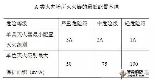 新規(guī)范規(guī)定的A類火災場所滅火器的最低配置基準規(guī)定:單具滅火器最小配置滅火級別為: 嚴重危險級為3A;中危險級為2A;輕危險級為1A;