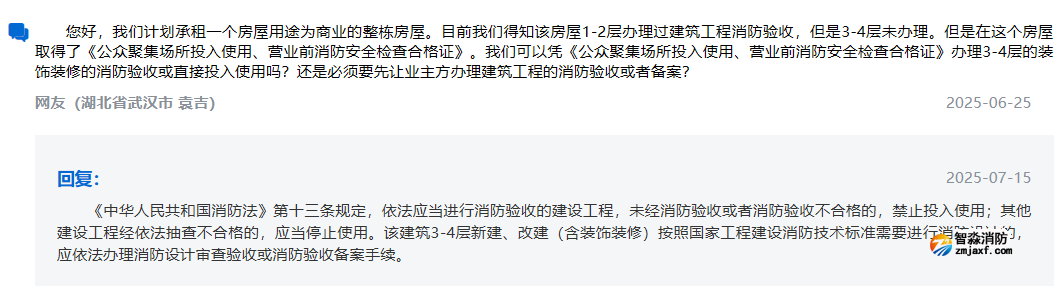 咨詢:您好,我們計(jì)劃承租一個(gè)房屋用途為商業(yè)的整棟房屋。目前我們得知該房屋1-2層辦理過(guò)建筑工程消防驗(yàn)收,但是3-4層未辦理。但是在這個(gè)房屋取得了《公眾聚集場(chǎng)所投入使用、營(yíng)業(yè)前消防安全檢查合格證》。我們可以憑《公眾聚集場(chǎng)所投入使用、營(yíng)業(yè)前消防安全檢查合格證》辦理3-4層的裝飾裝修的消防驗(yàn)收或直接投入使用嗎?還是必須要先讓業(yè)主方辦理建筑工程的消防驗(yàn)收或者備案?