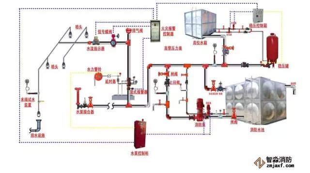 組成:①濕式報(bào)警閥②過濾器③延時(shí)器④壓力開關(guān)⑤水力警鈴⑥管網(wǎng)⑦水流指示器⑧噴頭