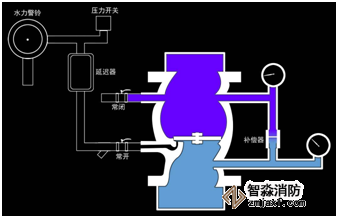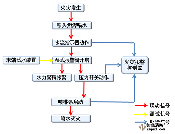 當(dāng)保護(hù)區(qū)域內(nèi)發(fā)生火災(zāi),環(huán)境溫度不斷上升,當(dāng)環(huán)境溫度達(dá)到閉式噴頭動作溫度時,噴頭動作,灑水滅火。使管網(wǎng)一側(cè)(系統(tǒng)側(cè))水壓下降,濕式報警閥閥瓣因上下壓差而開啟,向系統(tǒng)供水滅火。水流指示器因水流作用而動作,火災(zāi)報警控制器收到水流指示器的反饋信號