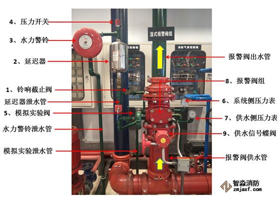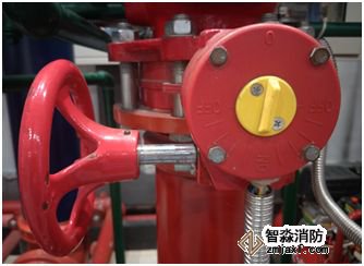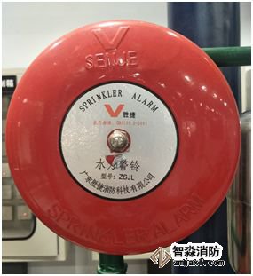 而發(fā)出聲光警報顯示火災(zāi)區(qū)域。同時由于濕式報警閥的開啟,使一部分水流入報警管路,通過延時器延時后水力警鈴發(fā)出報警鈴聲,同時壓力開關(guān)動作向火災(zāi)報警控制器發(fā)出反饋信號,火災(zāi)報警控制器通過邏輯關(guān)系啟動噴淋泵。