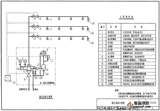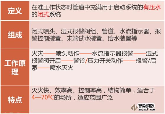 濕式系統(tǒng)由閉式灑水噴頭、水流指示器、濕式報警閥組以及管道和供水設(shè)施等組成,準(zhǔn)工作狀態(tài)時管道內(nèi)充滿用于啟動系統(tǒng)的有壓水的閉式系統(tǒng)。