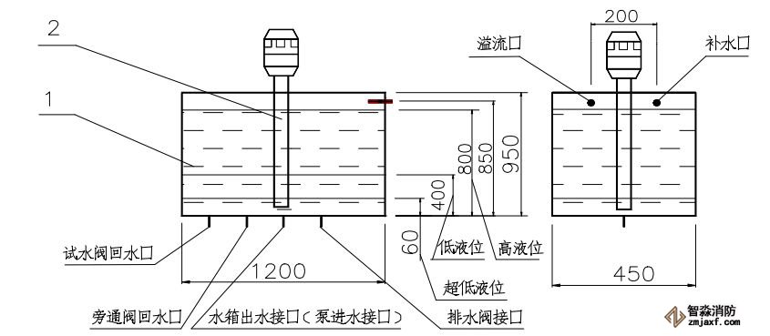 儲水箱在使用過程中,一是要確保向水箱注水時里面氣體順利排出,二是防止儲水箱里面水過滿,所以結合實際需要在儲水箱一側設置一滿液位溢水閥。