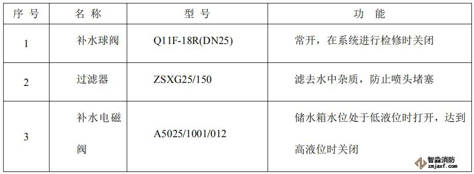 水箱自帶補水電磁閥、連桿浮球液位儀,補水電磁閥由電氣控制柜控制,通過它能自動保證水箱中的水位適中,不需要任何人為操作。當水箱水位低于低液位時,連桿浮球液位儀輸出相關信號給電氣控制柜,由電氣控制柜給出DC24V開閥信號,補水電磁閥開啟,給水箱注水;當補水到水箱水位高于高液位時,連桿浮球液位儀輸出相關信號給電氣控制柜,由電氣控制柜斷開DC24V開閥信號,補水電磁閥關閉,補水自動完成。