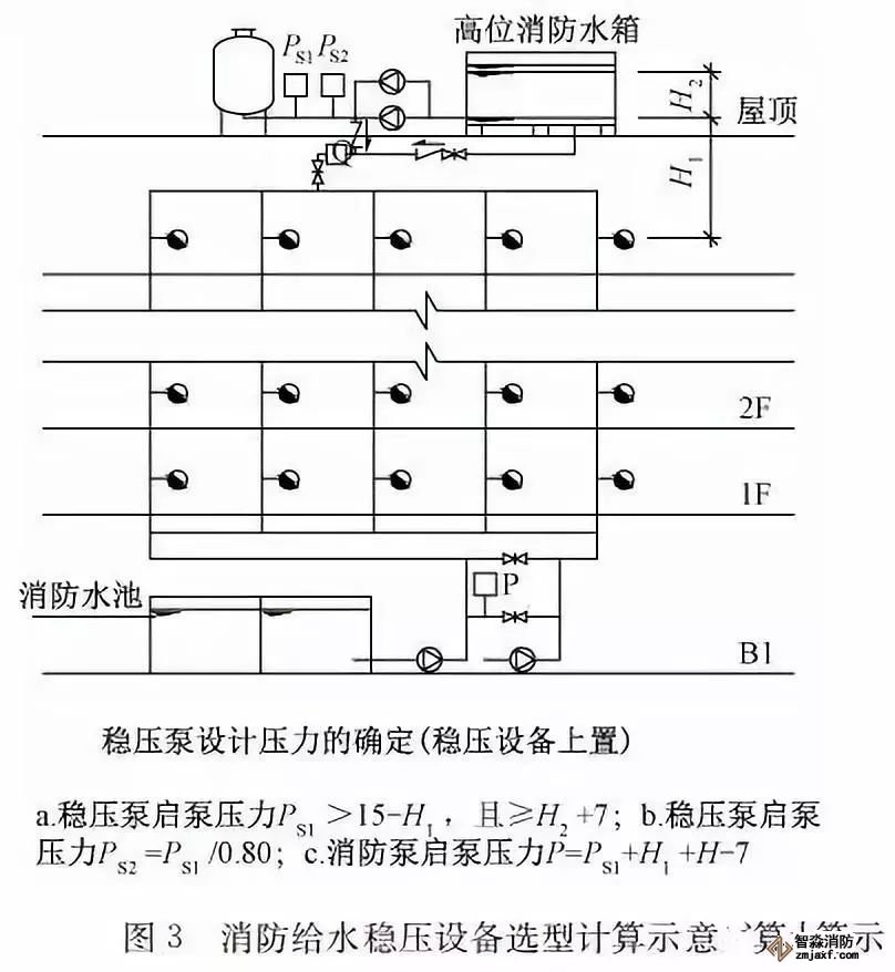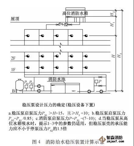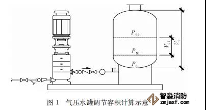 臨時高壓消防給水系統(tǒng)一般均應設置高位消防水箱(除符合規(guī)范規(guī)定可不設的情形外),且對其設置高度有一定要求。日本規(guī)范規(guī)定自動噴水滅火系統(tǒng)屋頂消防水箱最不利的最低供水壓力為0.15 MPa,美國、英國規(guī)范則要求0.10 MPa。我國1987年版和2006年版“建規(guī)”對比均沒有規(guī)定,只在條文中要求重力自流的消防水箱應設置在建筑的最高部位。1982年版《高層民用建筑設計規(guī)范》(以下簡稱“高規(guī)”)首次提出屋頂消防水箱應滿足最不利消火栓的靜水壓力,但沒有提出設計參數,1995年版“高規(guī)”做了具體規(guī)定。國標圖集98S205編制目的是為解決臨時高壓消防給水系統(tǒng)高位消防水箱設置高度滿足不了系統(tǒng)最不利點靜水壓力時應設增壓設施的要求,其為消防專用的增壓穩(wěn)壓設備的主要功能只是火災初期時、消防主泵啟動前,確保具有足夠消防壓力的30 s儲水量進行初期火災撲救,直至消防主泵全負荷啟動運行。這里更多的還是強調增壓的概念,設備類似于氣壓供水,發(fā)揮主要作用的是氣壓水罐,穩(wěn)壓水泵的作用是在3 min內,補足氣壓水罐內實際穩(wěn)壓水容積。利用氣壓水罐所設定的P1、P2、PS1和PS2運行壓力來控制穩(wěn)壓泵運行工況。P1為根據計算求得消火栓系統(tǒng)或自動噴水滅火系統(tǒng)中最不利點所需的消防壓力作為氣壓水罐的充氣壓力。平時管道系統(tǒng)如有滲漏泄壓等情況,控制穩(wěn)壓水泵不斷補水穩(wěn)壓,在PS1、PS2(啟動-停止)反復運行,一旦有火情,管道系統(tǒng)大量缺水,造成PS1下降(PS1→P2),降至P2時,立即啟動消防主泵。
